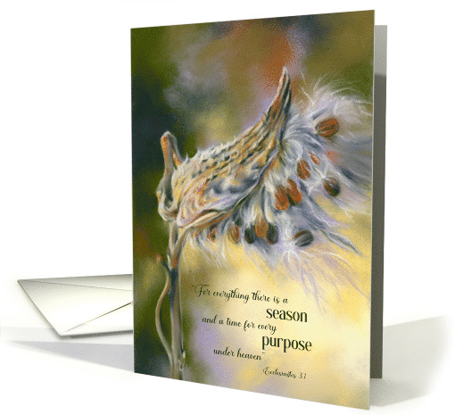 This card of religious encouragement features autumn themed art in soft pastel hues of gold, green and rust accented with purple picturing a dried milkweed pod with soft topped seeds emerging along with a verse from the book of Ecclesiastes 3:1 in the Bible. “For everything there is a season, and a time for every purpose under heaven” appears on the cover an encouraging message on the inside.