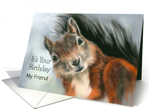 Wonderful wildlife artwork in pastel hues depicting a red and gray squirrel with a funny face and fluffy fur embellishes this birthday greeting that may be customized for a friend or for any recipient.
