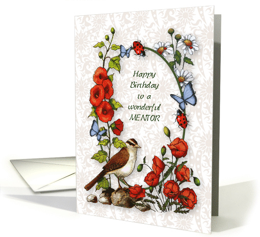 The front of this card features a nature lover's delight: an oval framework decorated with various flowers, butterflies, ladybugs, and a bird. The background is a very light floral pattern. Words inside the oval say, "Happy Birthday to a wonderful MENTOR". Inside, there is a little verse, but, as always, this part of the card may be edited and personalized, if desired.
