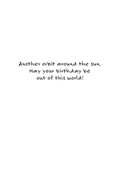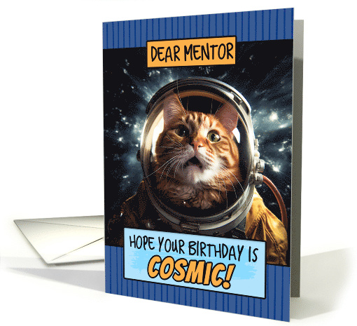 A ginger cat in a space suit is wishing you a cosmic birthday from outer space on a blue striped background. A fun card to send to your wonderful mentor for their special day.