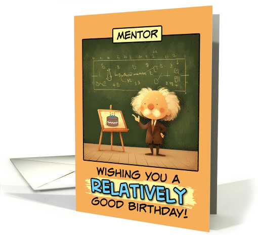 This birthday greeting card humorously depicts a famous scientist standing in front of a chalkboard filled with complex equations and calculations. In front of him is an easel displaying a simple illustration of a birthday cake with candles. The text "Wishing you a RELATIVELY good birthday!" plays on the scientific connotations, creating a clever pun referencing both the theory of relativity in physics and wishing someone a "relatively" or moderately good birthday. This quirky, science/math-themed birthday card would likely appeal to someone with an interest or career in fields like physics, mathematics, engineering, or academia more broadly. It pokes gentle fun at the complexities of intellectual subjects while still celebrating the birthday humorously. So it would suit someone who doesn't take themselves too seriously despite their academic/technical leanings and can appreciate the lighthearted, punny twist on a birthday message, like your wonderful mentor!