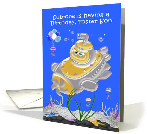 Wish your special foster son Happy Birthday with a card featuring a yellow submarine with eyes showing emerged in a pretty ocean with colorful jellyfish, coral, and starfish with white text. Design by Laurie Schneider, Elements by La galerie de Jackie