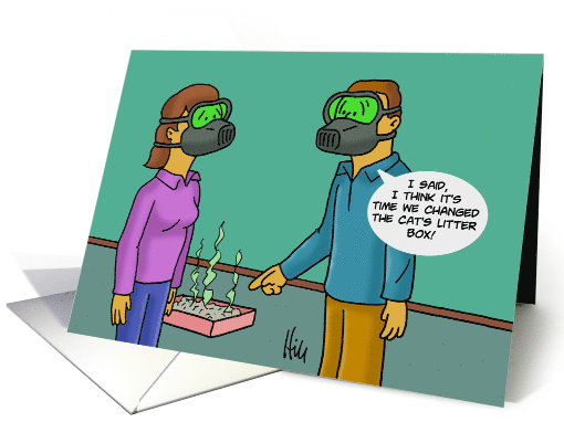 Friendship card with a cartoon showing a man and woman wearing gas masks. The man is pointing to the litter box and says: I said, I think it's time we changed the cat's litter box! Inside says: Guess it's an acquired scent!