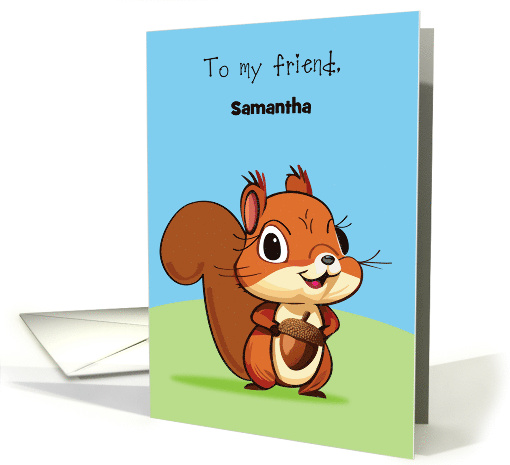 This is a custom name friendship card featuring my cartoon squirrel on a blue and green background. The personal name is placed under the headline. You may change the inside message, if you wish. ©Gail Pepin