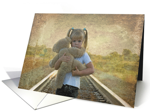 Sad little girl with teddy bear on railroad tracks for friendship.