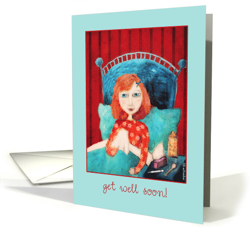 Send "get well soon" wishes to a friend or family member who's not feeling well with this cute card featuring a mixed-media painting of a sick girl in bed with a thermometer. You can edit text inside card yourself.