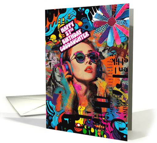 Knock your Goddaughter's socks off with this vibrant 27th birthday greeting that resembles a retro street poster. This design features a young woman wearing headphones, a large flower, a black text effect and a colorful dripping graffiti background. The inside sentiment is a simple verse with a nod to the Gen Z term "bussin" meaning amazing, fantastic, lovely, or cool. You are free to, as always at Greeting Card Universe, change the inside verse to suit your needs. THE DESIGN DOES COME ACROSS WITH A GRUNGE EFFECT THAT IS INTENTIONAL AND SHOULD NOT BE SEEN AS A PRINTING ERROR.