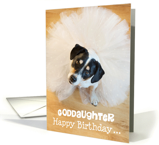 This is a funny birthday card for Goddaughter featuring a color photographic image of a Jack Russell Terrier dog wearing a beautiful off white tutu and looking cutely up at the camera with tilted head. Below photo the text is 'Goddaughter Happy Birthday ...' Inside it reads '... tutu you!'