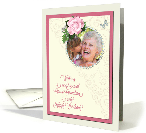 Add your photo to personalize a unique and stunning birthday card for a great grandma. Place your picture inside the diamond encrusted frame. a beautiful pink rose and jewelled butterfly completes the look. A very stylish and modern birthday card. All parts are printed.
