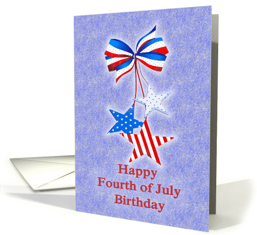 Sometimes birthdays and holidays come at the same time. It is easy to forget a holiday birthday in the general celebration. Remember a Fourth of July birthday with this card. It has a graphic image of three stars on strings hanging from a red white and blue ribbon bow. One star is blue with white stars, on is light blue with red and blue stars, one is red and white striped. on a blue background.