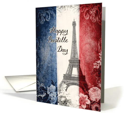 Wish friends and family a "Happy Bastille Day" with this stylish card featuring the Eiffel Tower in Paris, France and flowers on a blue/white/red background in vintage grunge/shabby chic look. You can edit text inside.