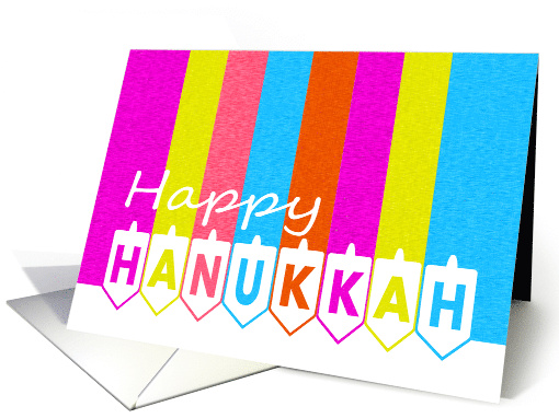 A modern twist on a classic holiday. This Hanukkah card features a vibrant rainbow of colors in a vertical stripe pattern. The words "Happy Hanukkah" are spelled out in white with a playful, handwritten font, each letter suspended from a stylized, dreidel-shaped banner. The bright and bold color palette gives this festive design a fresh, contemporary feel, making it perfect for sending warm wishes to friends and family