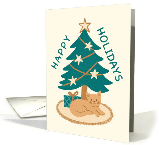 An illustration of a cute orange cat sitting under a Christmas tree decorated with stars and garlands, surrounded with gifts and the words Happy Holidays alongside the tree. The card is a pale yellow colour with a teal green tree and hints of gold and orange throughout.