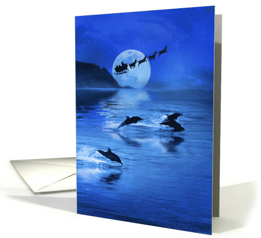 Beautiful dolphins shimmer as they surf with the moonlight and still waters. A big full moon, with the ole guy flying on his way and the dolphins gliding with him on the journey. A fun fantasy sea ocean coastal holiday card.