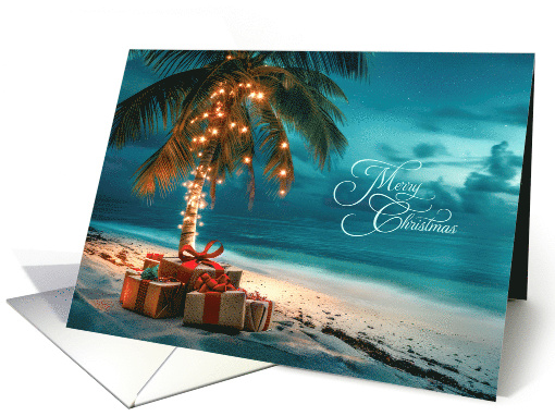 Wishes for a Merry Christmas with a beautiful seaside scene of a lit palm tree with white holiday lights and wrapped gifts under the tree - all sitting on a quiet and gorgeous sandy beach.