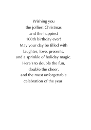 A century of life now that’s something to toast with Santa himself! This extraordinary Christmas birthday card features Santa presenting a cake gleaming with “100,” surrounded by stars, snowflakes, and pure wonder. Perfect for honoring someone who’s reached this incredible milestone with love, laughter, and faith, this design is both festive and timeless.