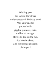 Turning four on Christmas Day means extra presents, extra fun, and extra sparkle! This charming card shows Santa with a cake glowing with “4,” perfectly blending milestone birthday joy with holiday cheer. A festive keepsake for kids who make the season bright.