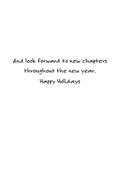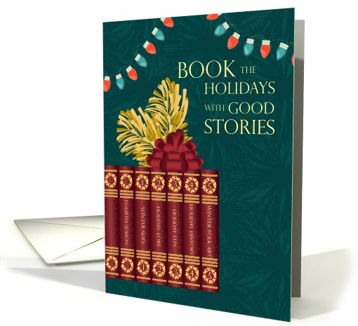 Illustrated Happy Holiday card with a book theme. Appropriate for book collectors (Bibliophilia), book lovers, teachers, writers or avid readers. Red and green Christmas lights drape haphazardly over a row of dark red hardback books. Different titles are holiday themed. Each volume is surrounded by a holly wreath. A large illustrated bow sits on top trimmed with golden pine branches. Outside text: Book the holidays with good stories. Inside verse: And look forward to new chapters throughout the new year. Happy Holidays