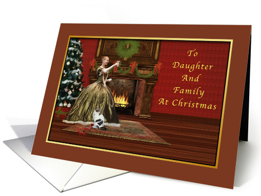 This vintage Daughter and Family's Christmas card in tones of red, brown, and green, shows a young woman raising her glass in a holiday toast. In the background is a roaring fire and a small cat sits by her side. The fireplace and rug are the artwork of Scrap and Tubes at Digital Scrap Designs.