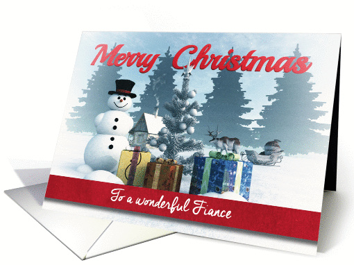 A Christmas scene for your Fiance with a snowman, a Christmas tree, a lot of presents, a reindeer with a sledge and at the background a cottage with smoking chimney. There is inside a text which you can customize to something very personal.