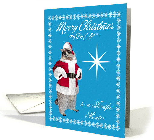 Wish your terrific mentor a Merry Christmas with an adorable raccoon dressed as Santa Claus, Bullwinkle holding on to his belt next to a pretty star. Background is a light blue with a white snowflake border with white fancy text. Inside like all cards on GCU can be personalized by you if you wish.