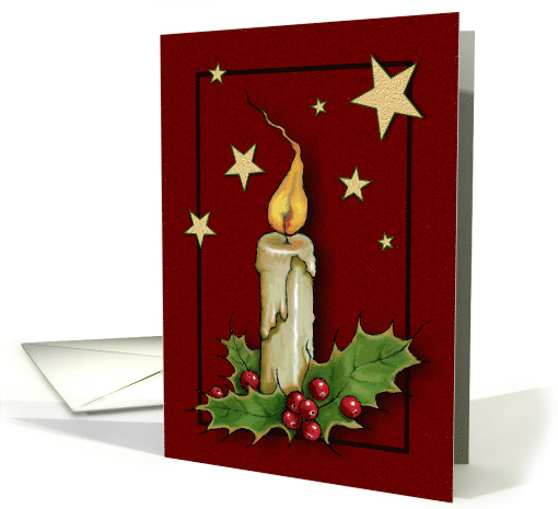 The front of this card features an illustration of a brightly burning candle with holly leaves and bright red berries. Several golden stars complete the picture. Inside, there is a little verse, but, as always, this part of the card may be edited if desired.