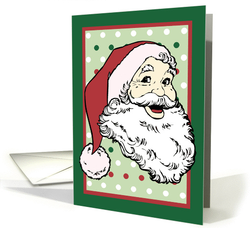 A joyous Santa Claus with polka dots and green border on this cute Christmas card. 2014 © Julia Bryant.