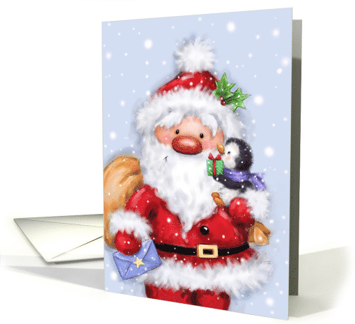 Merry Christmas, Santa and Cute Penguin Holding Present and Letter