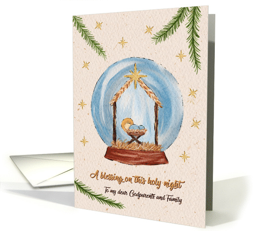 A Christmas greeting card featuring a watercolor-style illustration of a nativity scene inside a snow globe. Baby Jesus lies in a manger under a rustic stable with a bright golden star above. The background is soft blue with scattered golden stars and green fir branches decorating the scene. The front text reads “A blessing on this holy night” in a warm script font. Godparents and Family