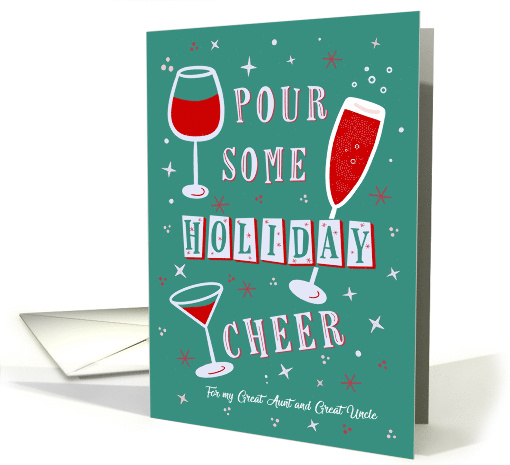 This festive greeting card features retro-style typography with red holiday drinks and the cheerful pun “Pour Some Holiday Cheer.” Set against a teal background with playful stars and sparkles, it's the perfect card to celebrate the season in style. Whether you're toasting with wine, bubbles, or a holiday cocktail, this card brings the party spirit to any loved one. For Great aunt and great uncle