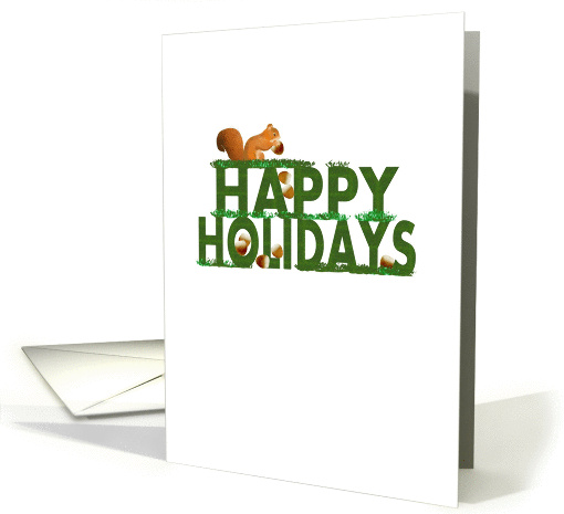 A red squirrel standing on top of the 'Happy Holidays' greeting. It is holding a hazelnut.