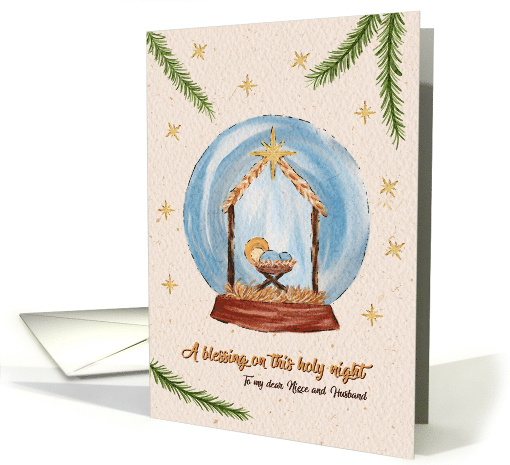 A Christmas greeting card featuring a watercolor-style illustration of a nativity scene inside a snow globe. Baby Jesus lies in a manger under a rustic stable with a bright golden star above. The background is soft blue with scattered golden stars and green fir branches decorating the scene. The front text reads “A blessing on this holy night” in a warm script font. Niece and husband