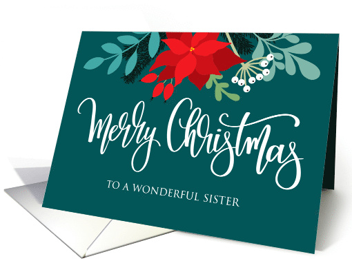 A lovely card with Christmas florals (including poinsettia, rose hip, Winter berries and pine branches) on the top of the card with the words Merry Christmas to a wonderful sister on the front of the card. © Ness Nordberg