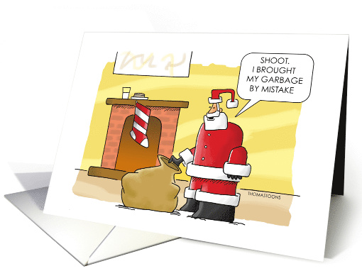 This is a cartoon Christmas card about Santa at someone's home looking in his sack. He says,"Shoot, I brought my garbage by mistake". It is from the Thomastoons cartoon catalog and is suited for almost anyone.