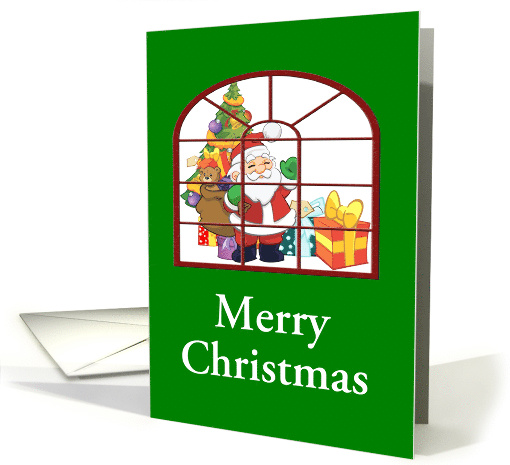 Custom card featuring a window view of Santa and his bag of toys. Wish friends and family Merry Christmas with this cute custom card.