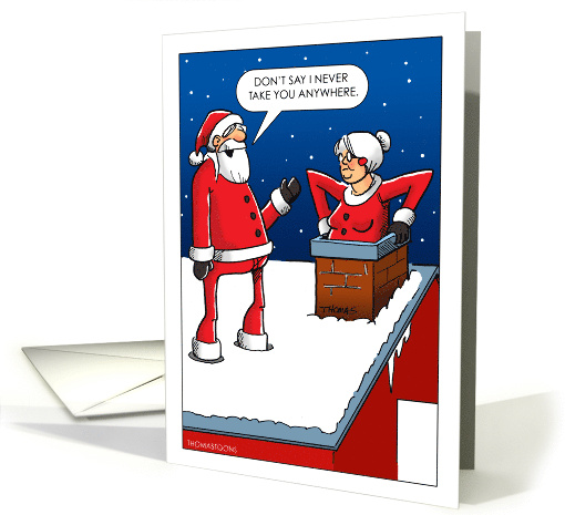 This is a humorous Christmas card with Santa on a roof looking at Mrs. Claus climbing down a chimney. He says,"Dont say I never take you anywhere." It's from the Thomastoons collection.