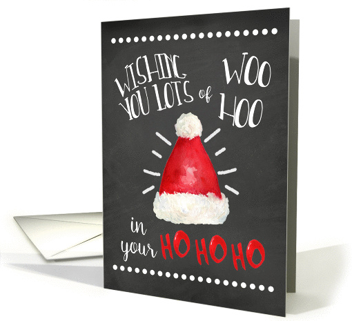 Send out Christmas wishes for lots of holiday Woo Hoo. Cute polka dots and watercolor designs on a chalkboard background. Santa hat and Ho Ho Ho by LABFcreations. Chalkboard background by CupcakeCutiees.