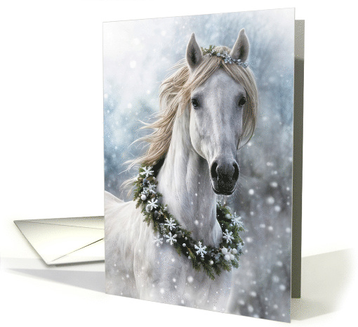 A beautiful horse and garland in the snow, a delightful way to share Season's Greetings during the Christmas holiday season.