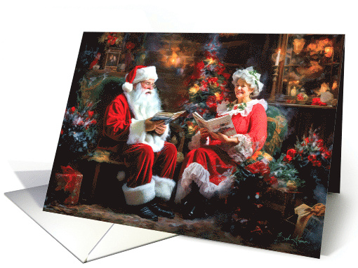 The Christmas card depicts a cozy and warm scene of Mr. and Mrs. Claus sitting together in front of a crackling fireplace. They are both dressed in their signature red and white outfits, with Santa's bushy white beard and Mrs. Claus's relaxed and smiling. In the background, the Christmas tree stands tall and decorated with twinkling lights and ornaments. The room is bathed in a warm and cozy glow, creating a serene and peaceful atmosphere.
