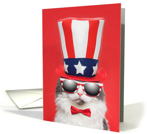 Looking totally cool in her patriotic gear an photographed on red, this sweet kitty is a fun way to say Happy 4th of July to anyone!