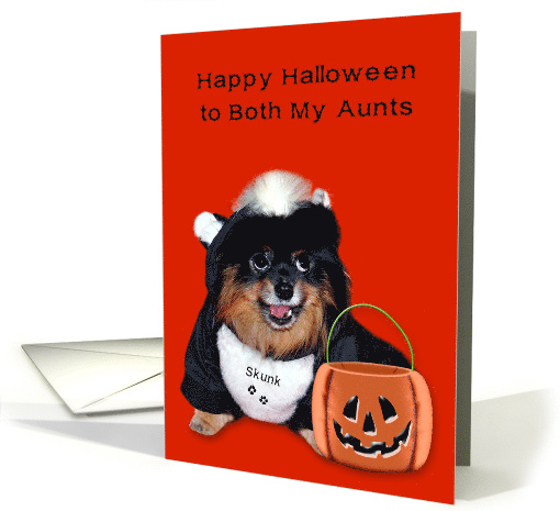 Wish both your aunts a Happy Halloween with an adorable Pomeranian, Pebbles dressed as a skunk, smiling, looking up while sitting behind a jack-o-lantern treat bucket on a dark orange background with black text.