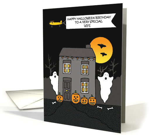A simple illustration of a spooky haunted house at night. A plane is flying over the house with a banner behind it that says 'Happy Halloween birthday to a very special wife'.