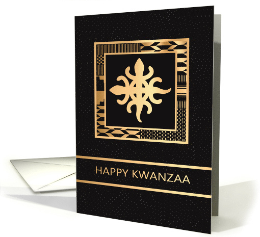 Celebrate the Kwanzaa principle of Ujima (Collective Work and Responsibility) with this striking card featuring the Funtunfunefu Denkyemfunefu Adinkra symbol. Translating to "Siamese Crocodiles," this motif symbolizes democracy and the importance of working together for a shared goal. The elegant outlined artwork is presented in a classic black and faux gold color scheme, a perfect and modern way to share the spirit of Kwanzaa with friends and family.