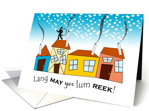 Happy New Year (Hogmanay) greeting card written in Scots language. Cover text is an old Scots saying/greeting for New Years "Lang may yer lum reek! (Long may your chimney smoke!) A greeting for prosperity for the New Year. Chimney sweep and houses courtesy:pupsik/rones/Openclipart.