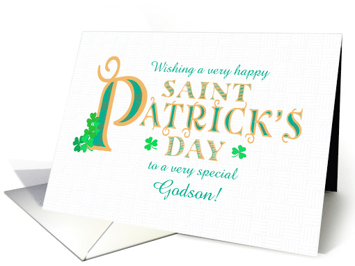 An elegant St Patrick's Day greeting card for your godson, with decorative lettering outlined in gold-colour, filled with a green pattern and decorated with clusters of shamrocks. The front cover greeting is 'Wishing you a very happy SAINT PATRICK'S DAY to a very special Godson', all on a lightly textured white background. The inside message is just a suggestion and you can easily change it or delete it altogether, if you wish.