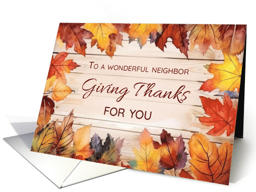 A Thanksgiving card for a neighbor, decorated with rustic wood and autumn leaves. A kindhearted way to share gratitude and friendship during the season of thanks. Discover more cards at my two stores: