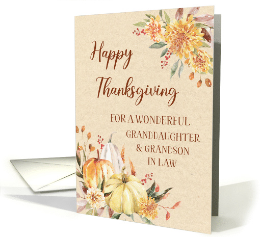 Happy Thanksgiving greeting card for your granddaughter and her husband with autumn flowers and pumpkin illustrations.