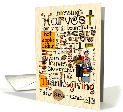 A pilgrim couple holding a turkey and a basket of harvest bounty is surrounded by Thanksgiving words and phrases arranged in a trendy "subway art" inspired word cloud on a light woodgrain background. A playful and trendy Thanksgiving card for your great grandpa