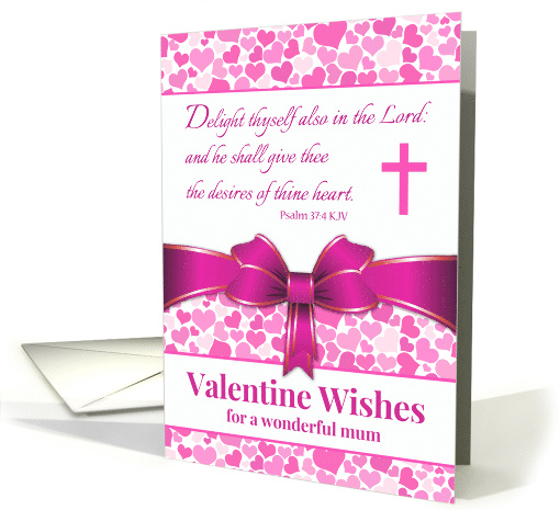 Valentine's Day wishes for a wonderful mum. Valentine's Day greeting card for a special mum, mom. Christian spiritual themed paper card with a bible verse (Psalm 37:4) on the cover. Hearts/bow from: PublicDomainPictures.