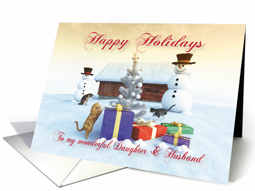 A cute Christmas snow scene to surprise your cat loving Daughter & Husband.Three cats are playing in the snow and at the background two snowmen are watching. Inside there is a text which you can customize to something very personal.